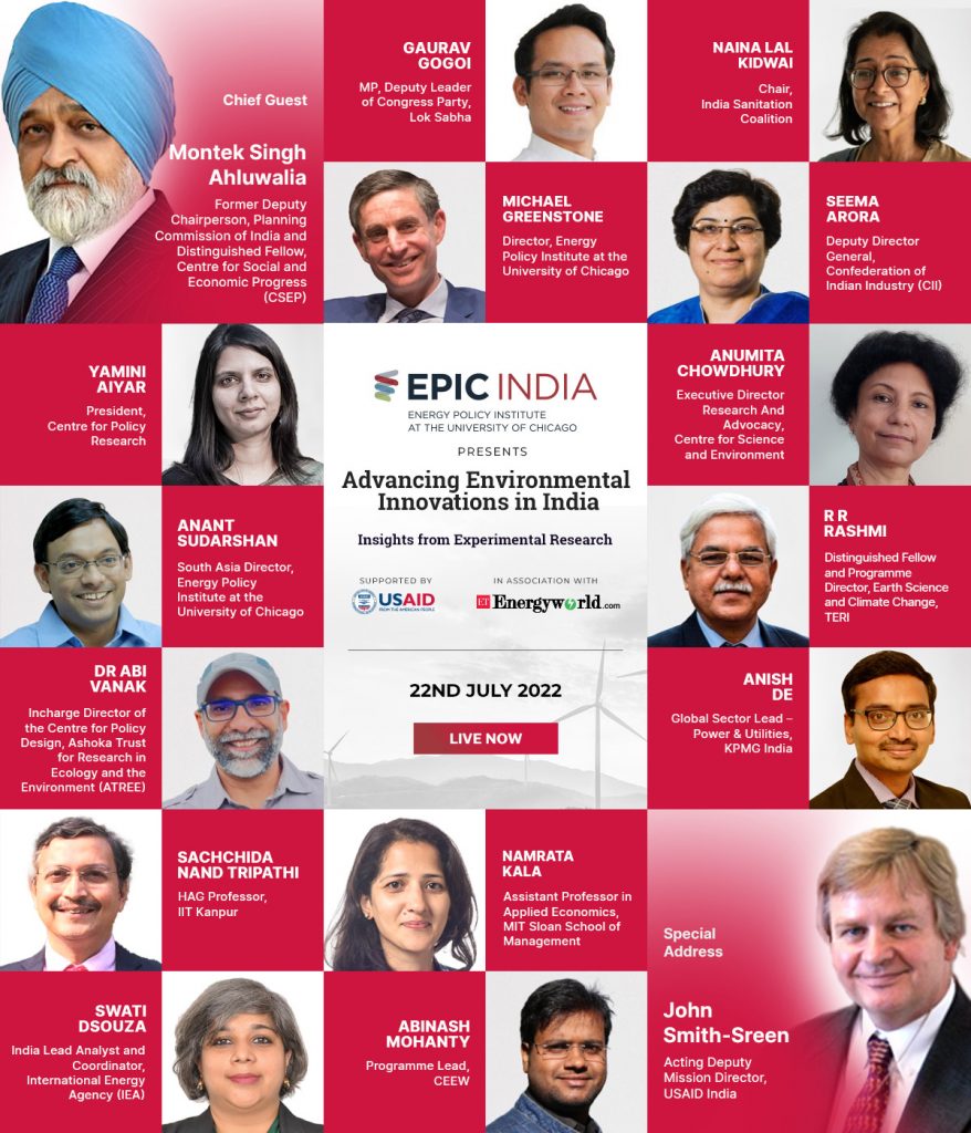 How can India’s climate strategy sustainably meet its development goals? Can market-based regulation aid in India’s efforts to meet its climate commitments? Why should India look into the health impacts of air pollution and urgently amend its air act? Questions like these and more were answered in a stimulating virtual conference called ‘Advancing Environmental Innovations in India’ on July 22, 2022. Hosted by EPIC India, the half-day conference organized in association with ET Energy World and supported by USAID had 18 speakers share insights with more than 350 participants from across the country. The attendees included leading researchers, academics, representatives from think tanks, non-profits, public sector organizations, and the corporate world.