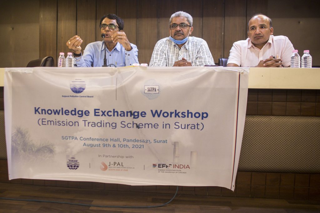 A two-day knowledge transfer workshop was organized at Surat, Gujarat, for a 20-member delegation comprising government officials from Punjab Pollution Control Board (PPCB) and industry representatives from Ludhiana, Punjab. This workshop jointly hosted by J-PAL South Asia and Energy Policy Institute at the University of Chicago (EPIC India), was attended by officials from Gujarat Pollution Control Board (GPCB), prominent representatives from South Gujarat Textile Processors Association (SGTPA), and the NCDEX e- Markets Limited (NeML). The workshop aimed to sensitize the participants about the pilot Emissions Trading Scheme (ETS) in Surat. The sessions included presentations describing the milestones in implementing the pilot ETS in Surat and the innovativeness offered by market-based instruments for environmental regulation.